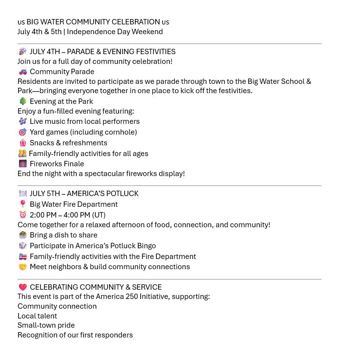 Residents are invited to participate as we parade through town to the Big Water School & Park—bringing everyone together in one place to kick off the festivities.