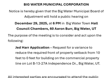 PUBLIC HEARINGBOARD OF ADJUSTMENT MEETING BIG WATER MUNICIPAL CORPORATION Notice is hereby given that the…