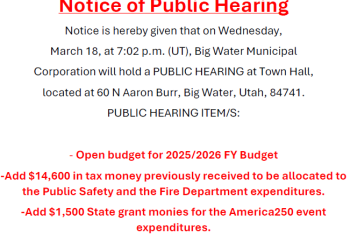 Big Water Town NOTICE OF PUBLIC HEARING Notice is hereby given that on Wednesday,…