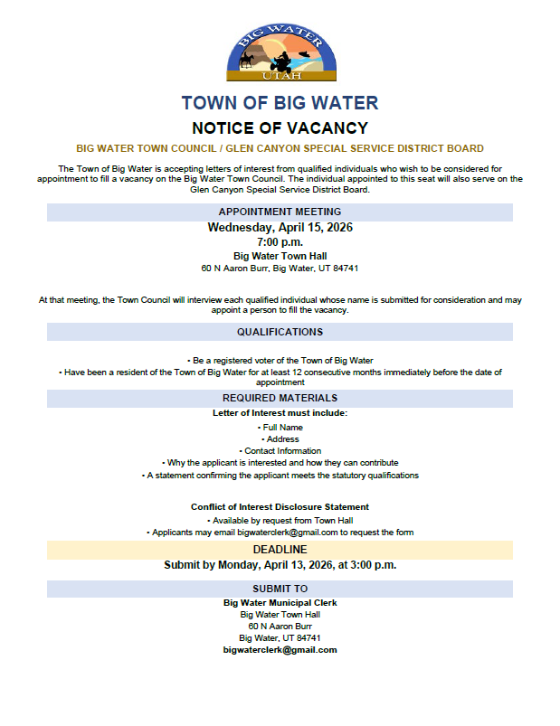 The Town of Big Water is accepting letters of interest from qualified individuals who wish to be considered for appointment to fill a vacancy on the Big Water Town Council. The individual appointed to this seat will also serve on the Glen Canyon Special Service District Board.