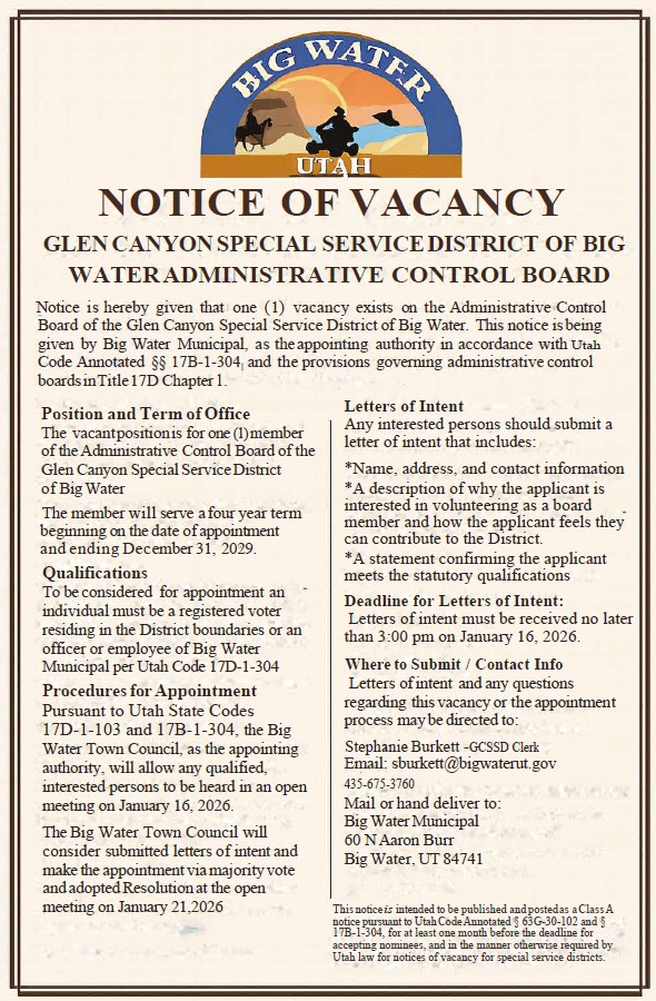 There will be a vacancy on the Glen Canyon Special Service District of Big Water Board starting in January of 2026. Please see flyer or contact Stephanie at 435-675-3760 or email [email protected] for more information or to submit a letter of intent.