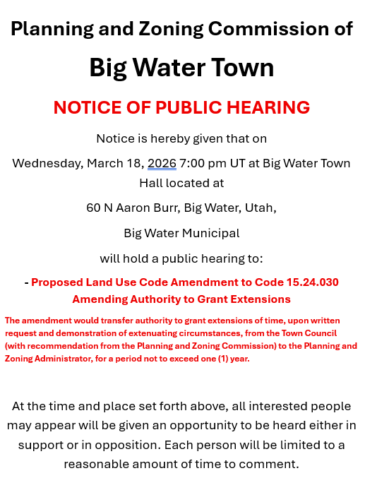 Wednesday, March 18, 2026 7:00 pm UT at Big Water Town Hall located at