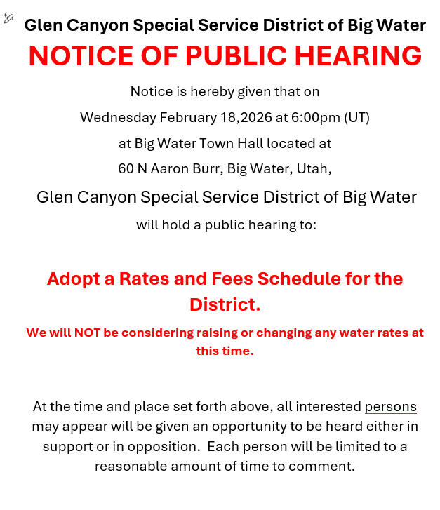 Glen Canyon Special Service District of Big Water NOTICE OF PUBLIC HEARING