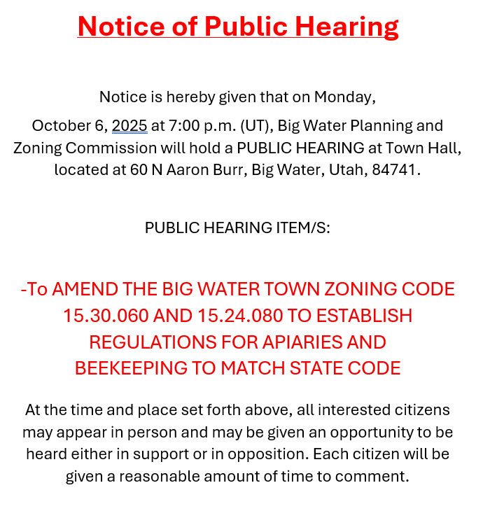 October 6, 2025 at 7:00 p.m. (UT), Big Water Planning and Zoning Commission will hold a PUBLIC HEARING at Town Hall, located at 60 N Aaron Burr, Big Water, Utah, 84741.
