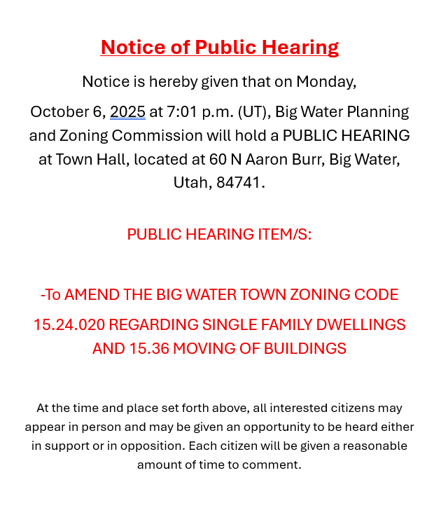 October 6, 2025 at 7:01 p.m. (UT), Big Water Planning and Zoning Commission will hold a PUBLIC HEARING at Town Hall, located at 60 N Aaron Burr, Big Water, Utah, 84741.