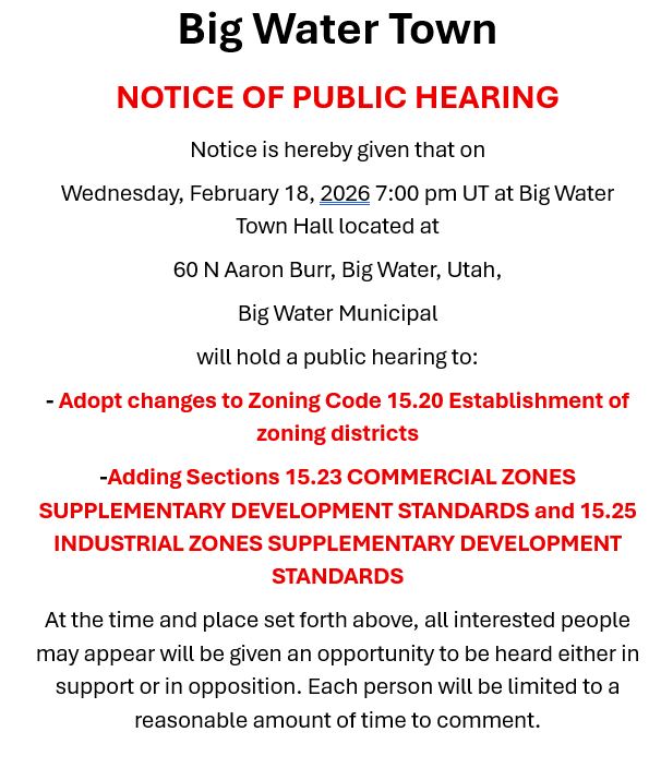 Wednesday, February 18, 2026 7:00 pm UT at Big Water Town Hall located at