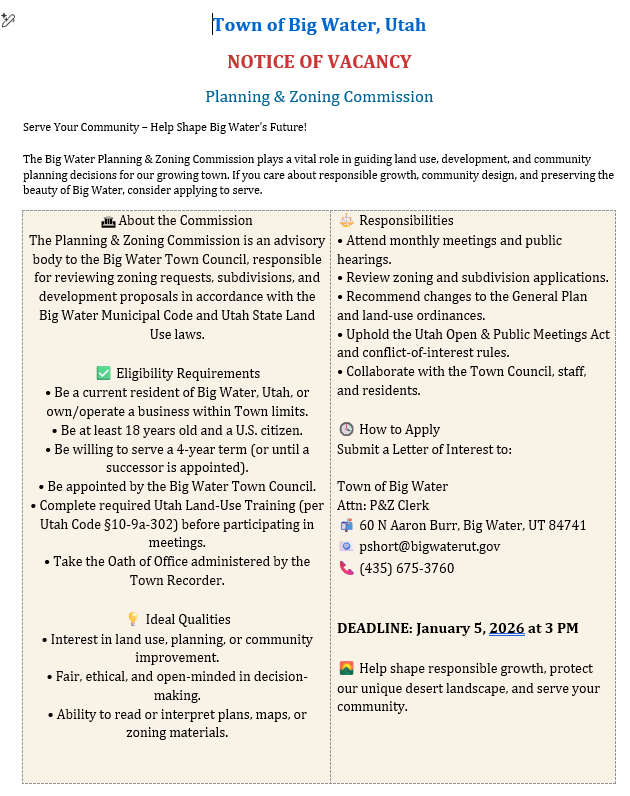 ✅ Eligibility Requirements • Be a current resident of Big Water, Utah, or own/operate a business within Town limits. • Be at least 18 years old and a U.S. citizen. • Be willing to serve a 4-year term (or until a successor is appointed). • Be appointed by the Big Water Town Council. • Complete required Utah Land-Use Training (per Utah Code §10-9a-302) before participating in meetings. • Take the Oath of Office administered by the Town Recorder.