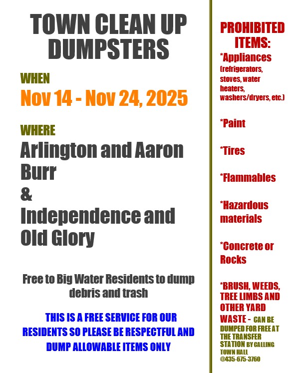 Fall Town Dumpsters will be available November 14- November 24, 2025. They will be placed on Arlington/ Aaron Burr and Independence/Old Glory. Please do not dump appliances, paint, tires, concrete, or hazardous materials. All green waste can be dumped at the Transfer Station for FREE by contacting Town Hall.