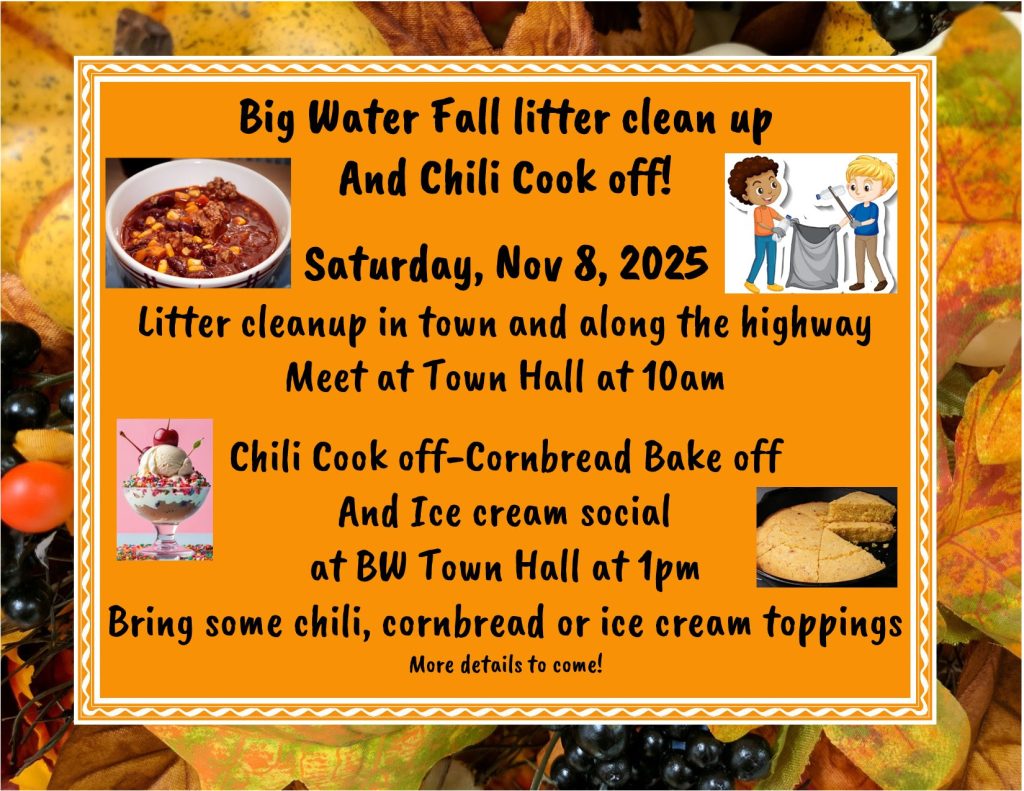 Big Water fall litter clean up in town and along the highway. Meet at Town Hall at 10am.